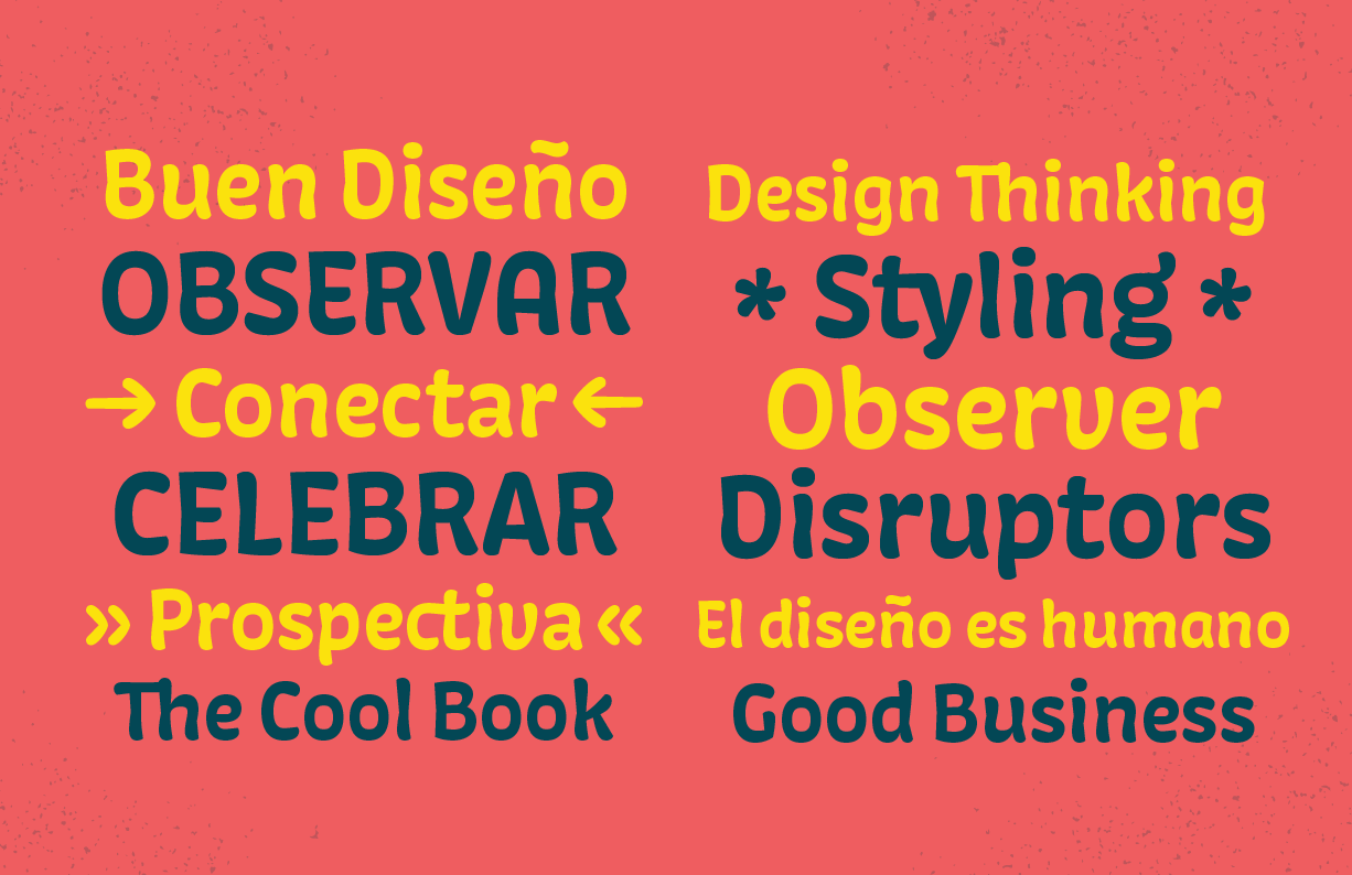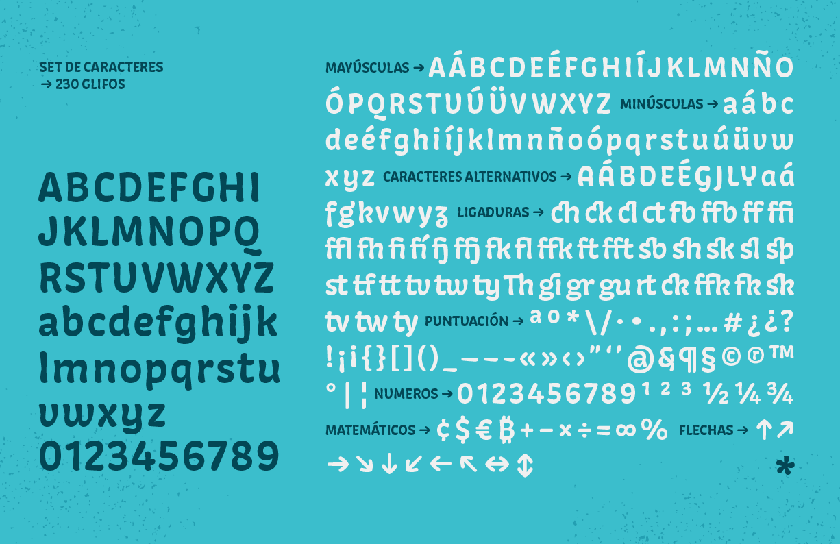The use of the typeface is intended for titles and short sentences in print and digital media. It has a set of characters that mainly covers Spanish, English and Portuguese, and it has a character set with a great variety of alternative characters and ligatures, which offer different composition possibilities and increase its expressive potential.