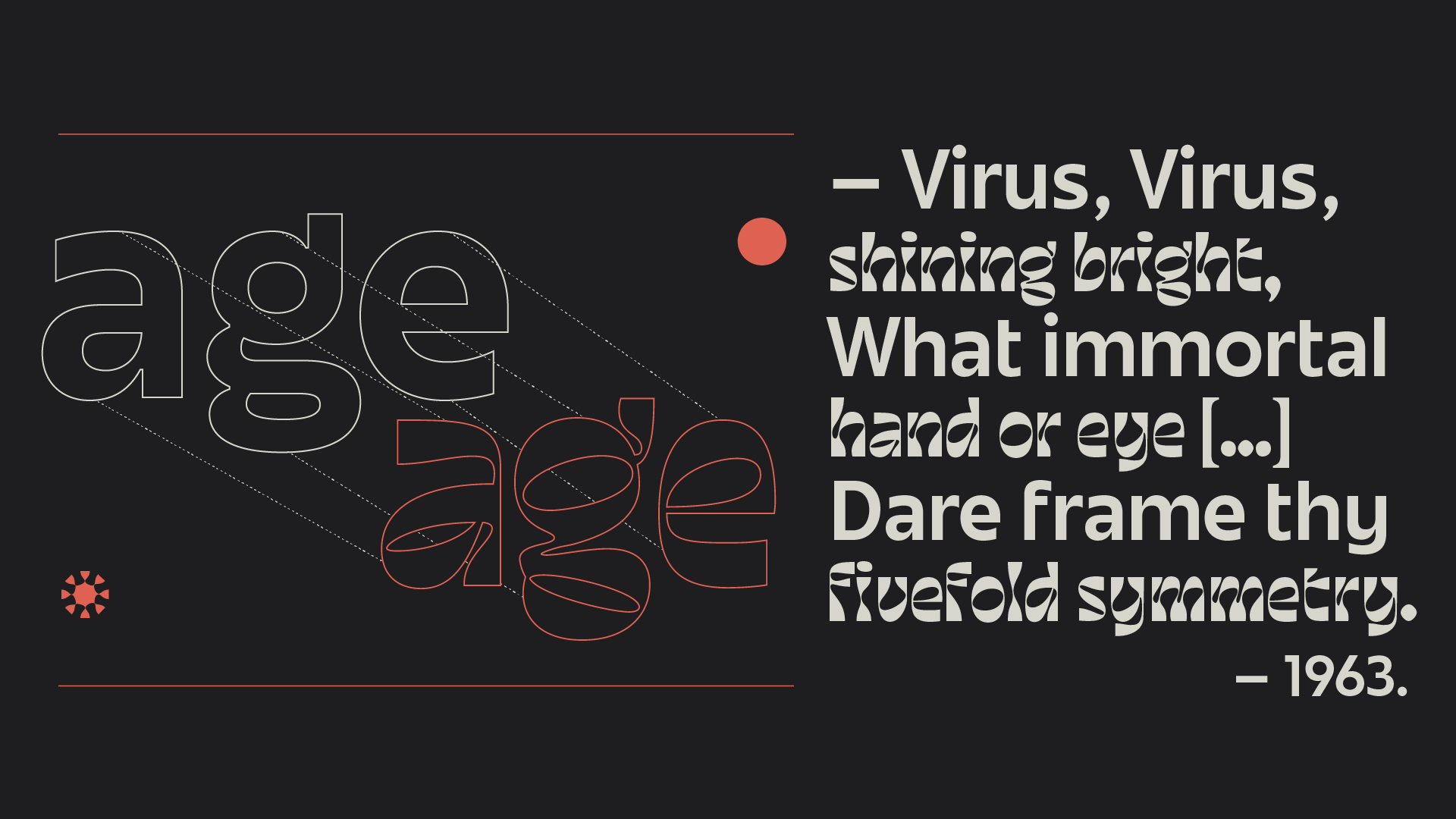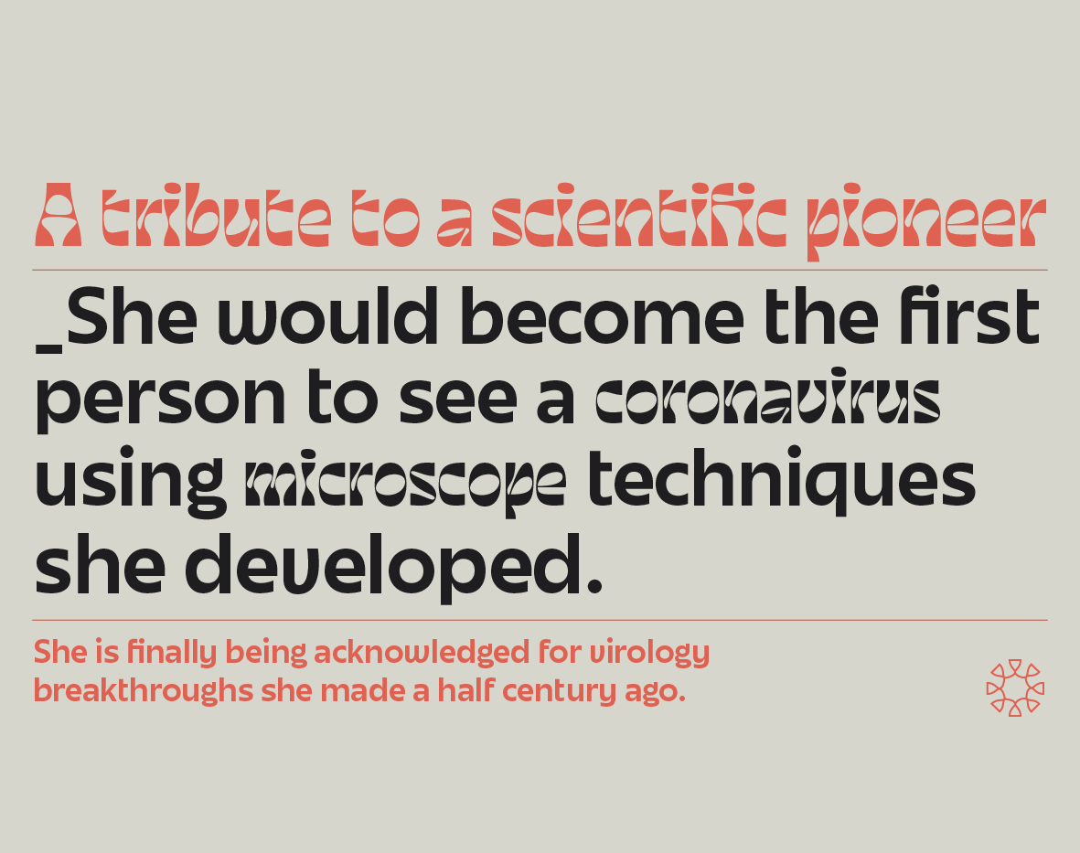 This is a variable font concept designed between Fer Cozzi and Oscar Guerrero. The idea was just have fun in isolation, but each one has fun differently. June's name is a tribute to June Almeida. She would become the first person to see a coronavirus using microscope techniques she developed.