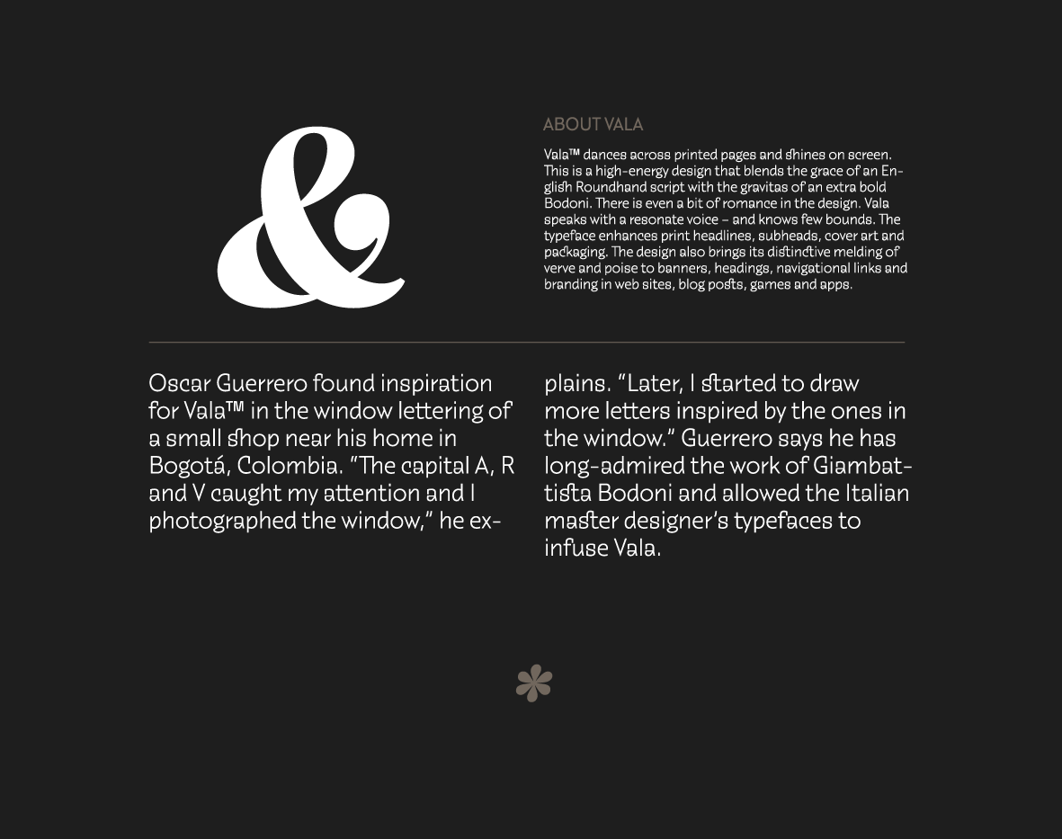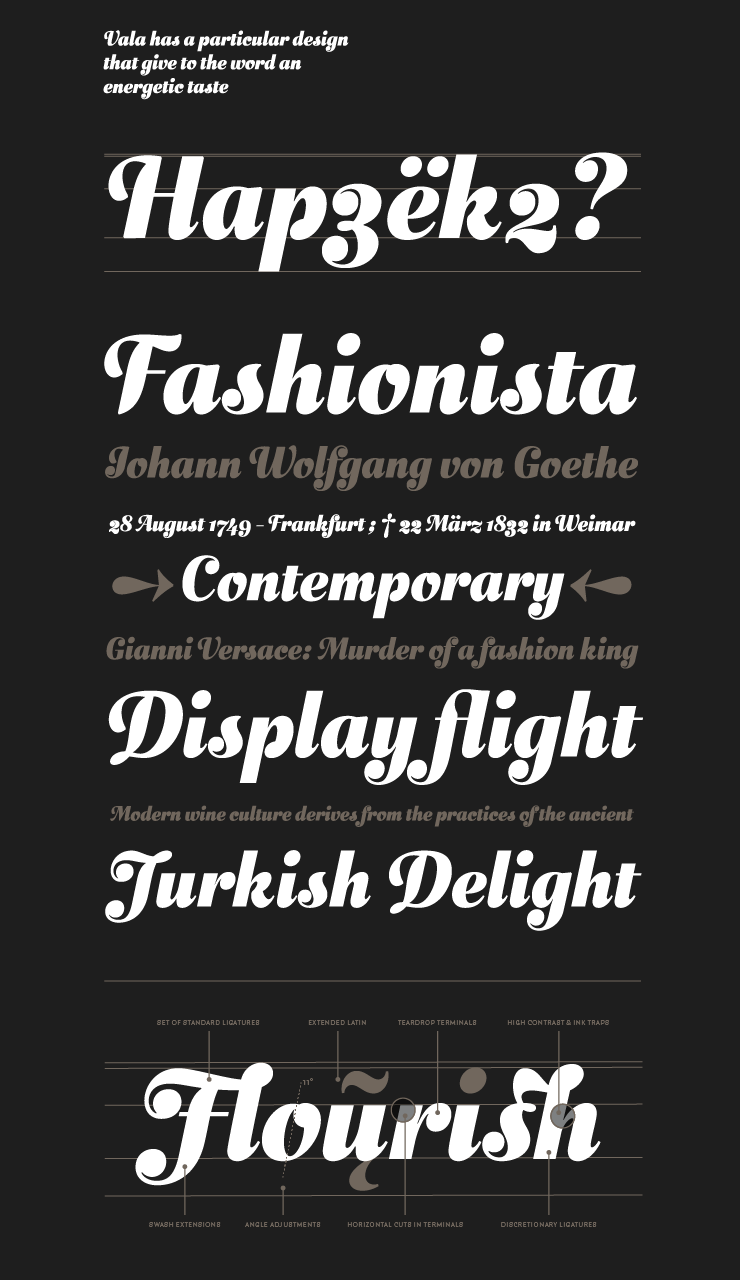 Vala shines in print headlines, subheads, cover art and packaging. Its spirited ball-terminals and a large x-height also brings a distinctive melding of verve and poise.