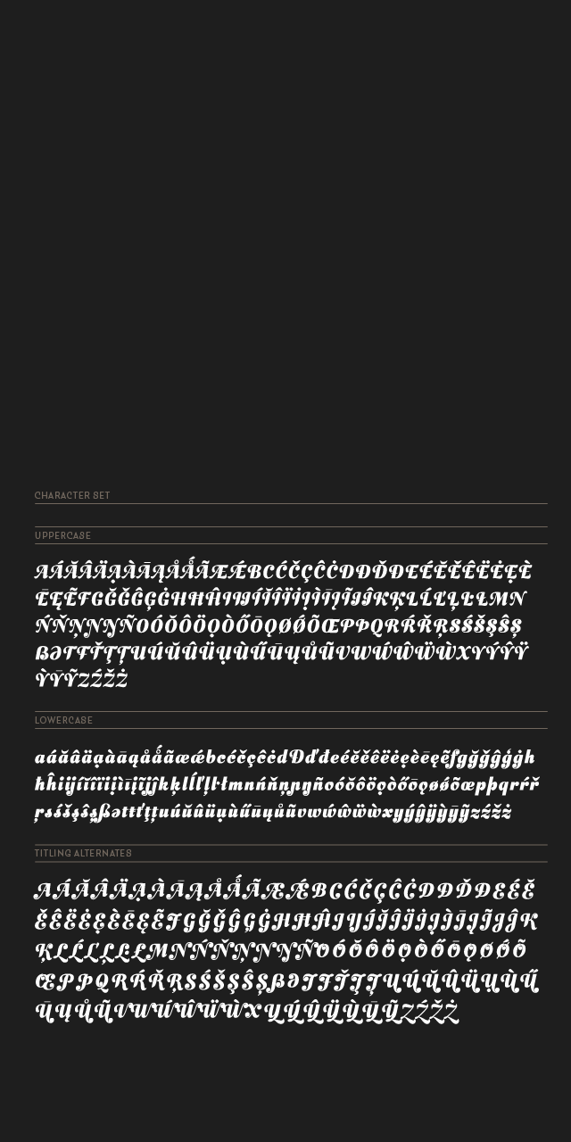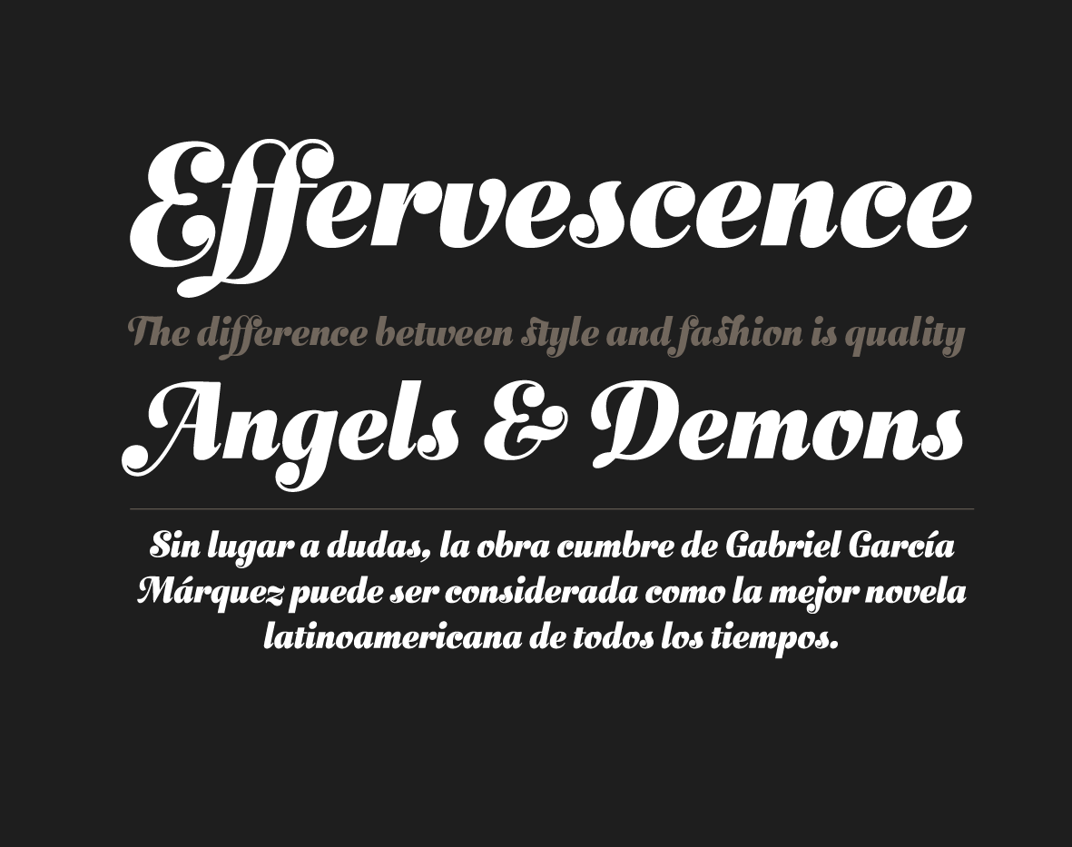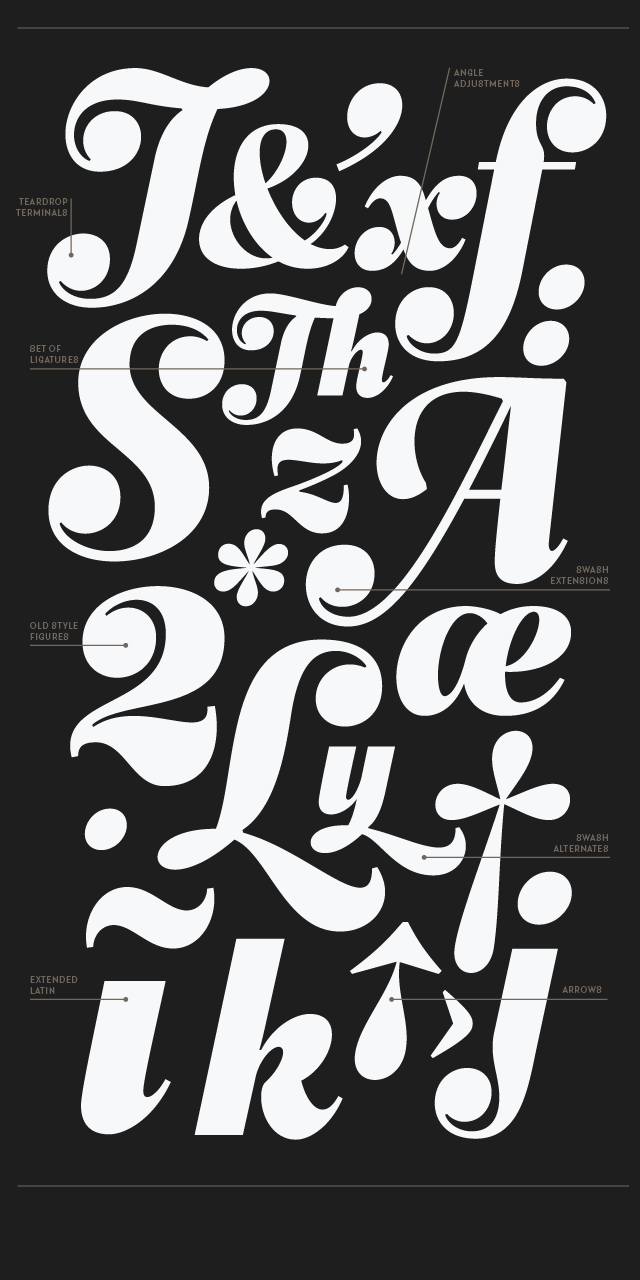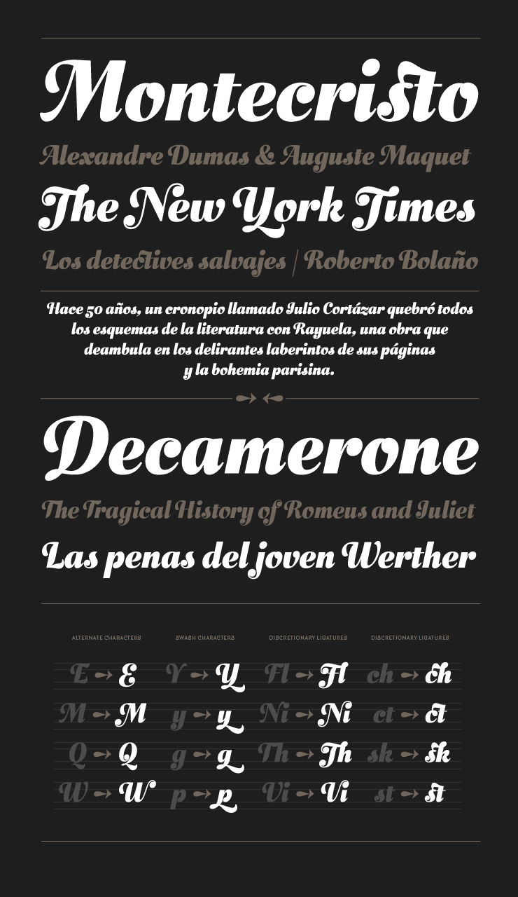 It has a large set of swash capitals, a suite of fancy ligatures, and a collection of lowercase alternative designs. The result is a design that emulates custom lettering for posters, headlines and logotypes.